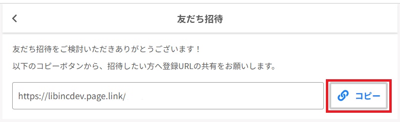 ③「友だち招待」画面に表示されている「登録URL(※https://libinc.page.link/から始まる個人別のURL)」をコピーし、紹介したい友人へ共有する