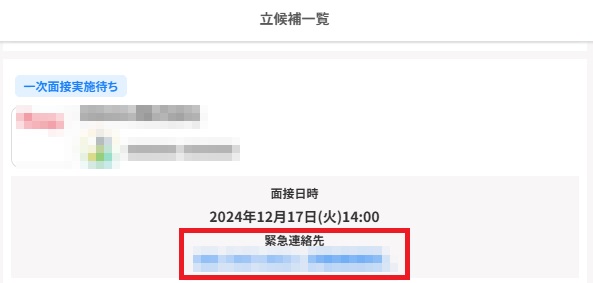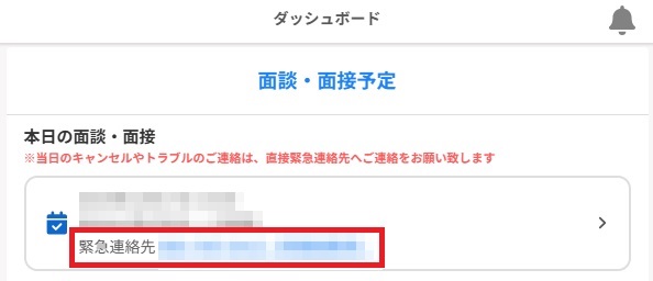 緊急連絡先は面談当日に限り「ダッシュボード」画面、または「立候補一覧」画面にてご確認いただけます。